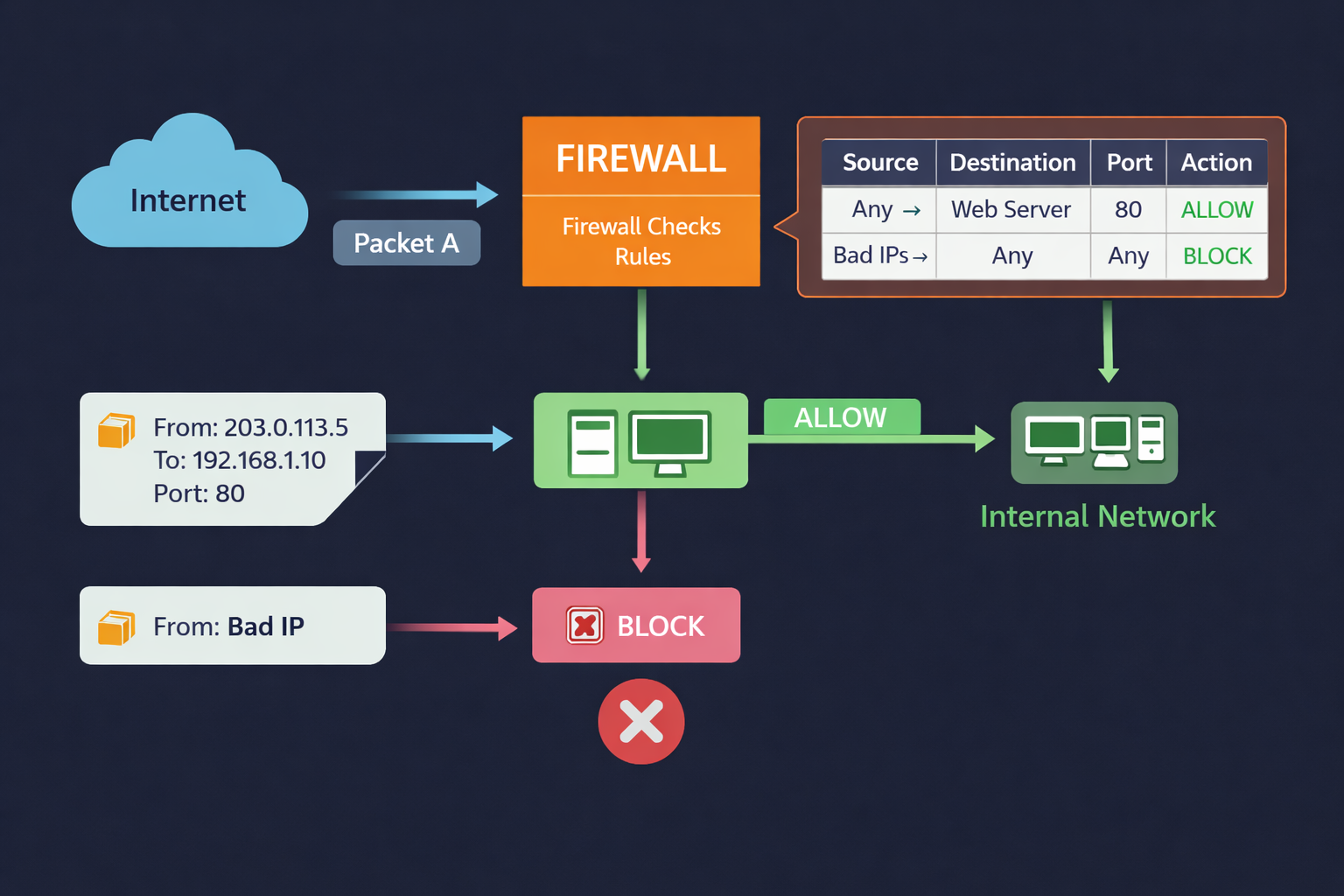 Think of a firewall as a security guard for your network. Just like a guard checks who enters a building, a firewall checks what data enters and leaves your network. It sits between your internal network (like your office or home computers) and the external world (the internet), making decisions about what traffic is allowed and what gets blocked.