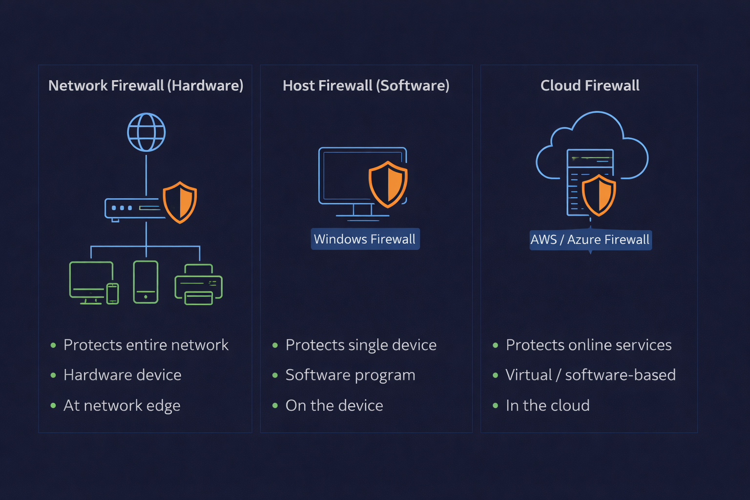 Think of a firewall as a security guard for your network. Just like a guard checks who enters a building, a firewall checks what data enters and leaves your network. It sits between your internal network (like your office or home computers) and the external world (the internet), making decisions about what traffic is allowed and what gets blocked.